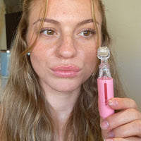 2️⃣Retire la punta de la aguja y aplique el sérum hidratante y reafirmante en su rodillo labial Lusiva™. Presione el botón situado en la parte inferior del rodillo para liberar el sérum.